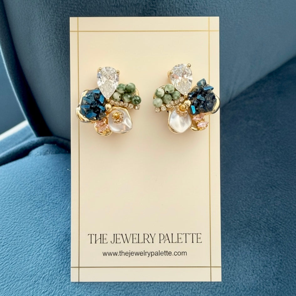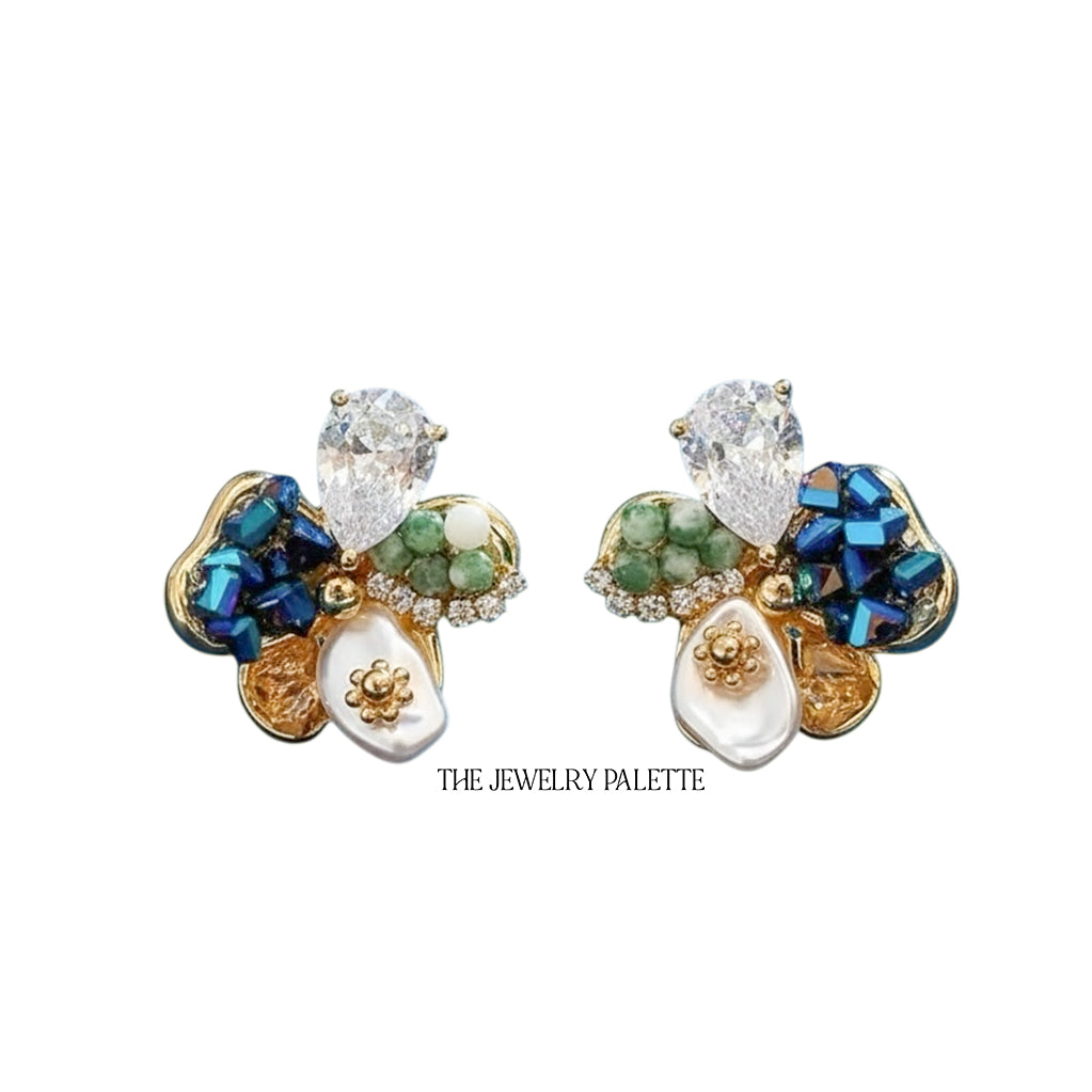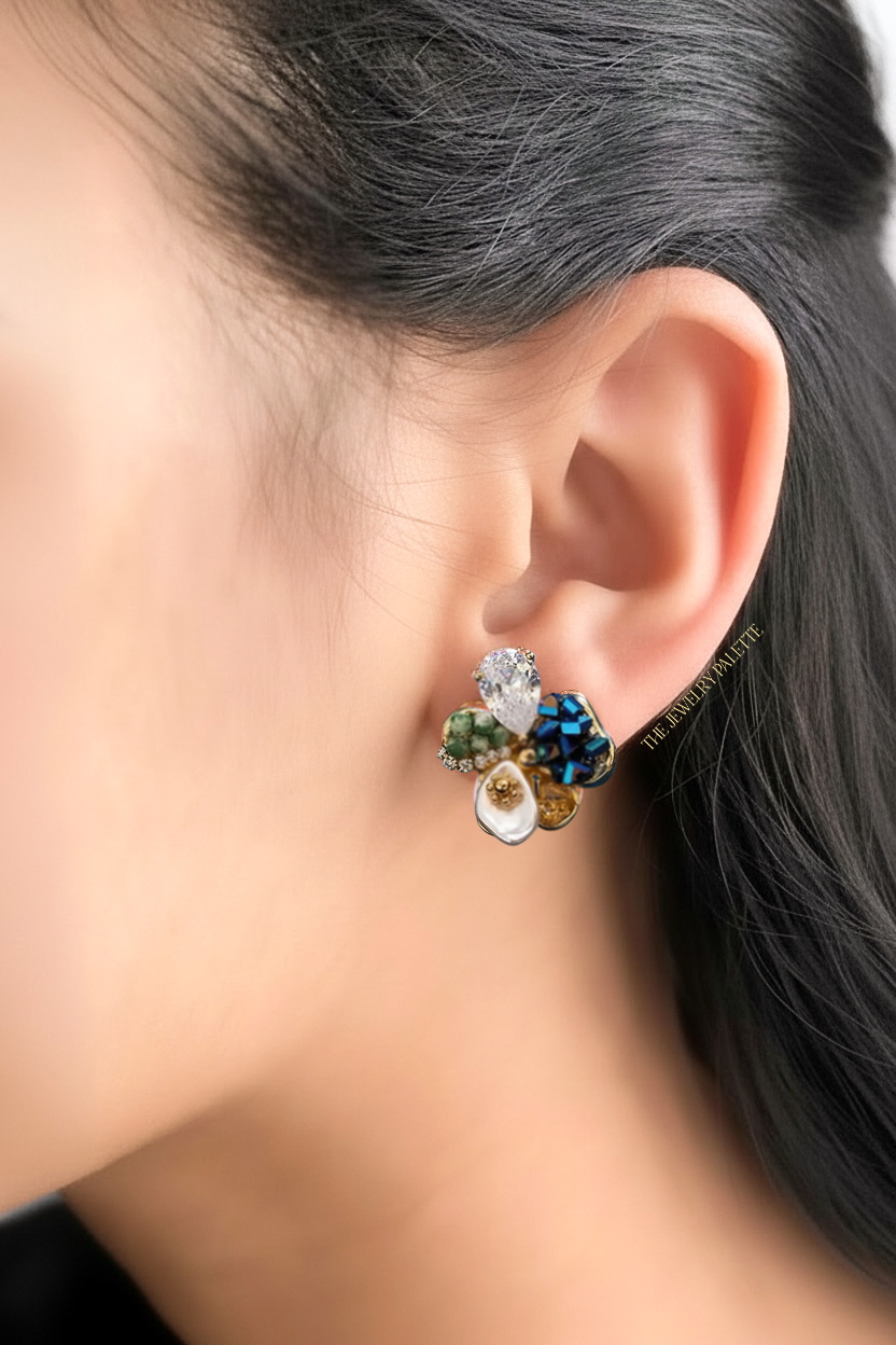 • The intricate Nyssa pearl stud earrings are the perfect accessory for your party outfits. Delicate embellishments with mother of pearl and gemstones make these a must-have for your collection.