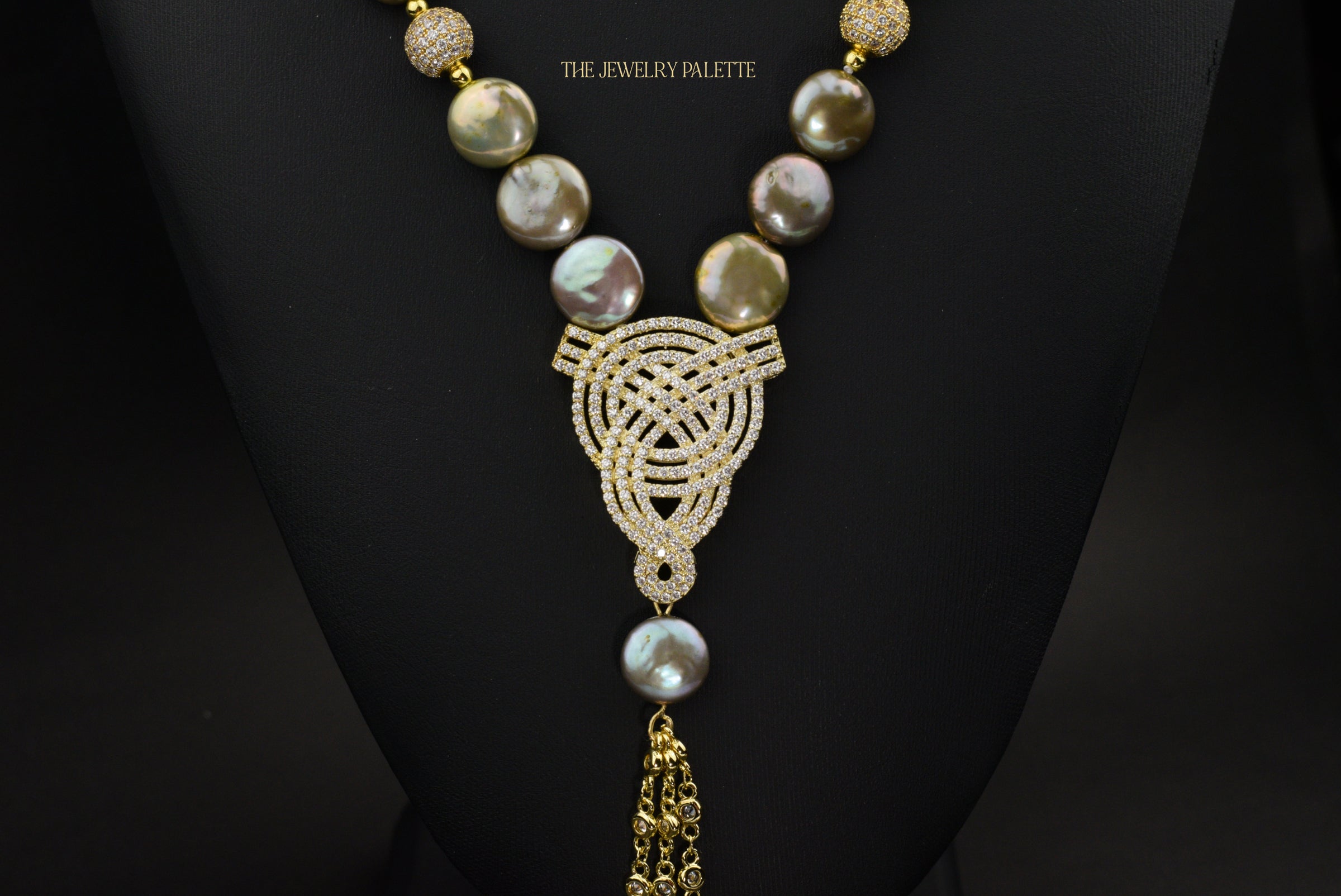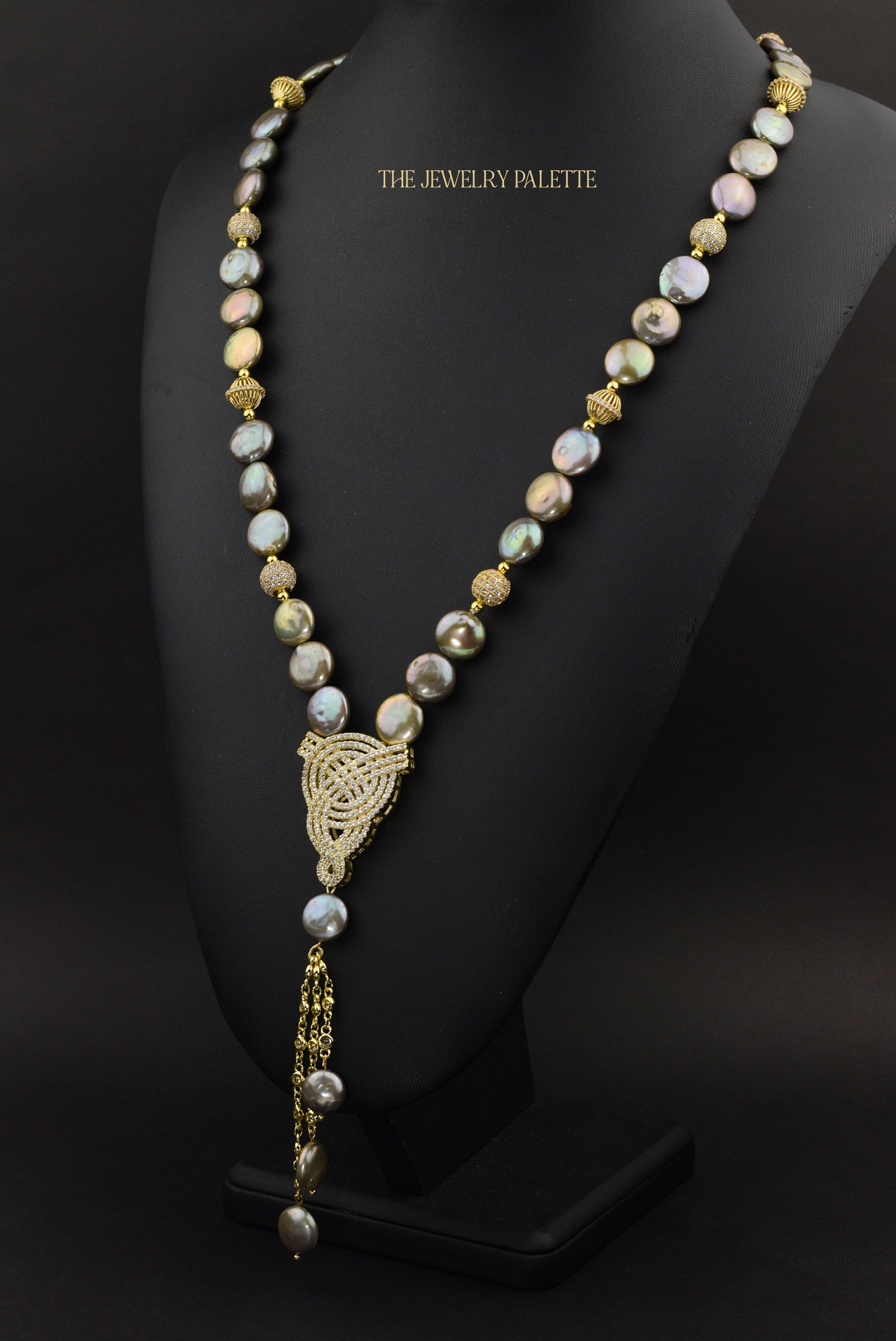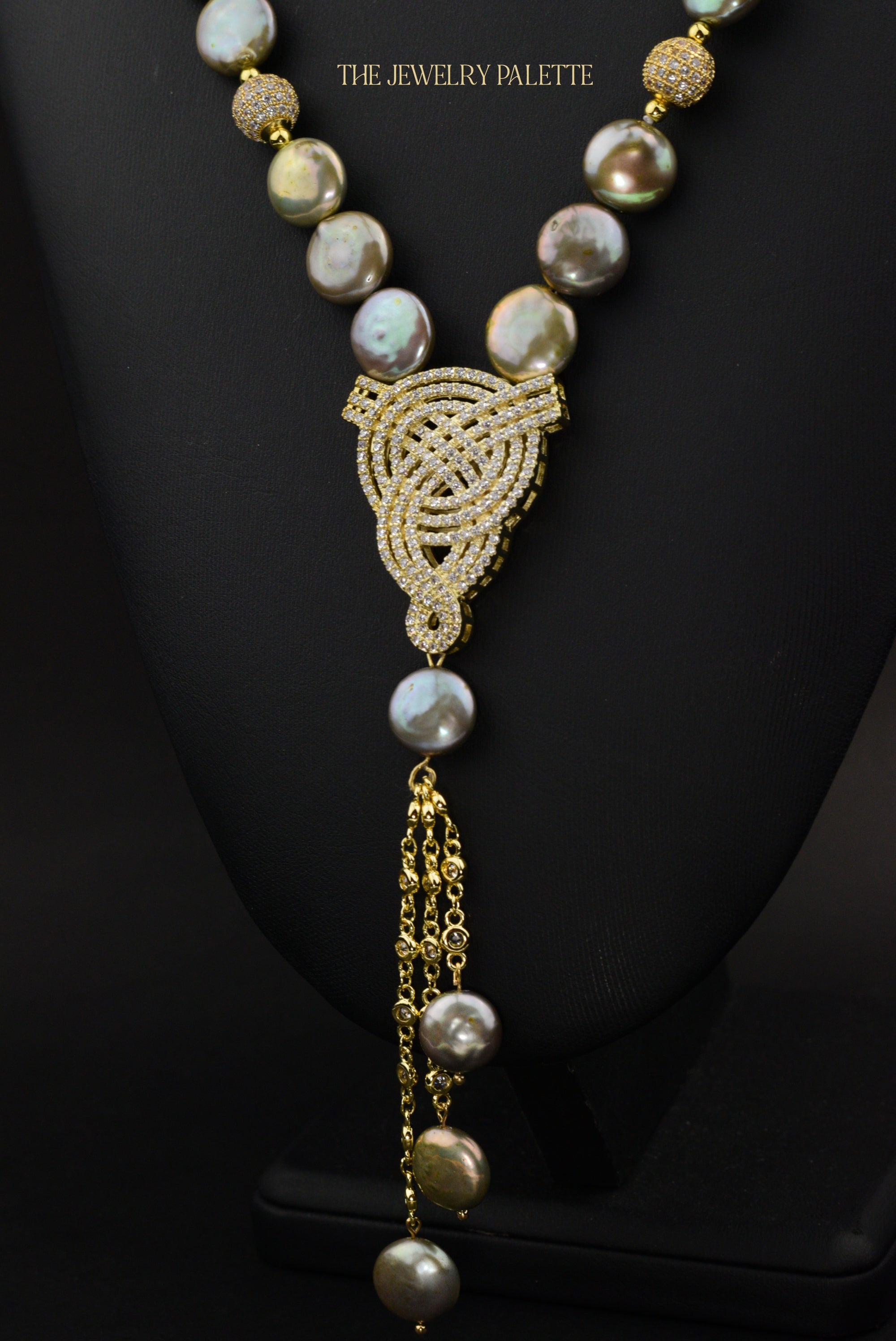 • Look sleek and sophisticated in the intricately designed Veronica necklace. It features lustrous coin pearls with iridescent hues of green, gold and grey and high quality zircon studded gold accents. A finely detailed zircon studded gold pendant and chain tassel add exceptional allure to this expensive-looking piece.