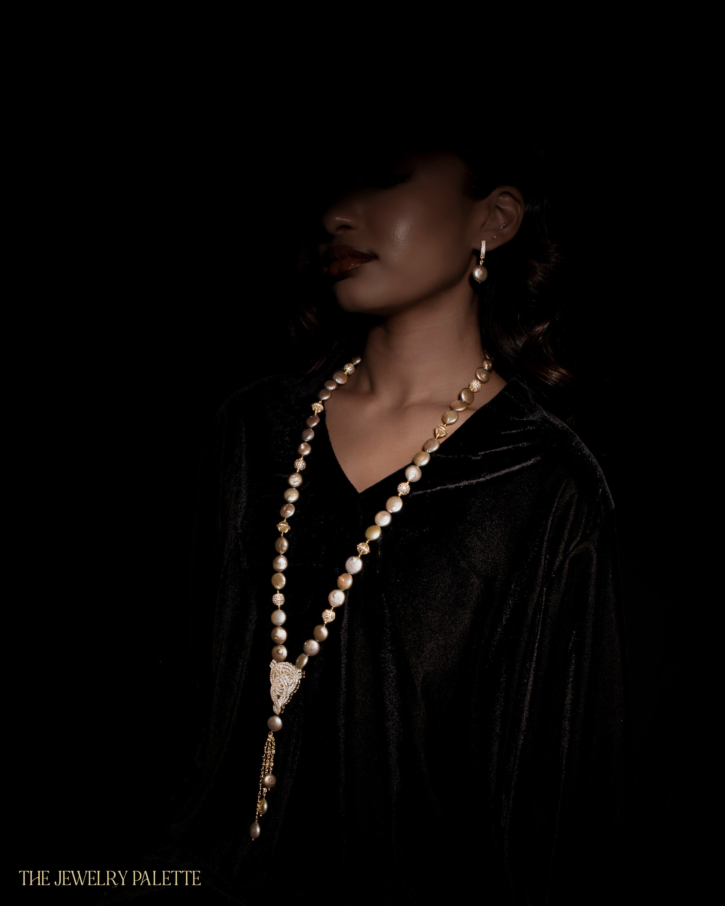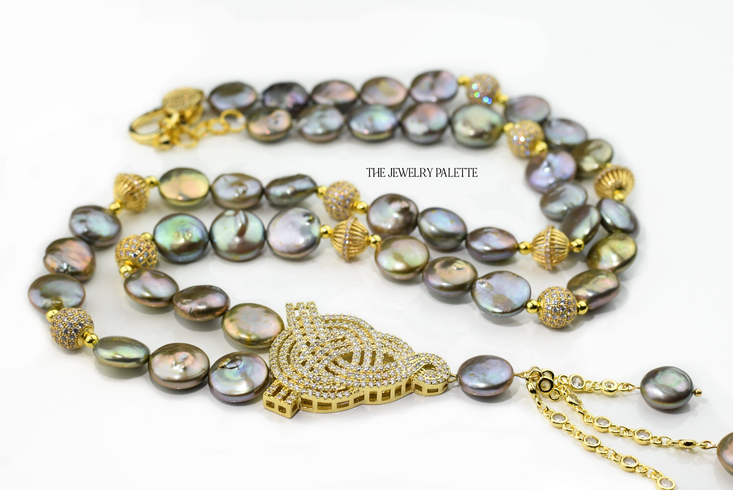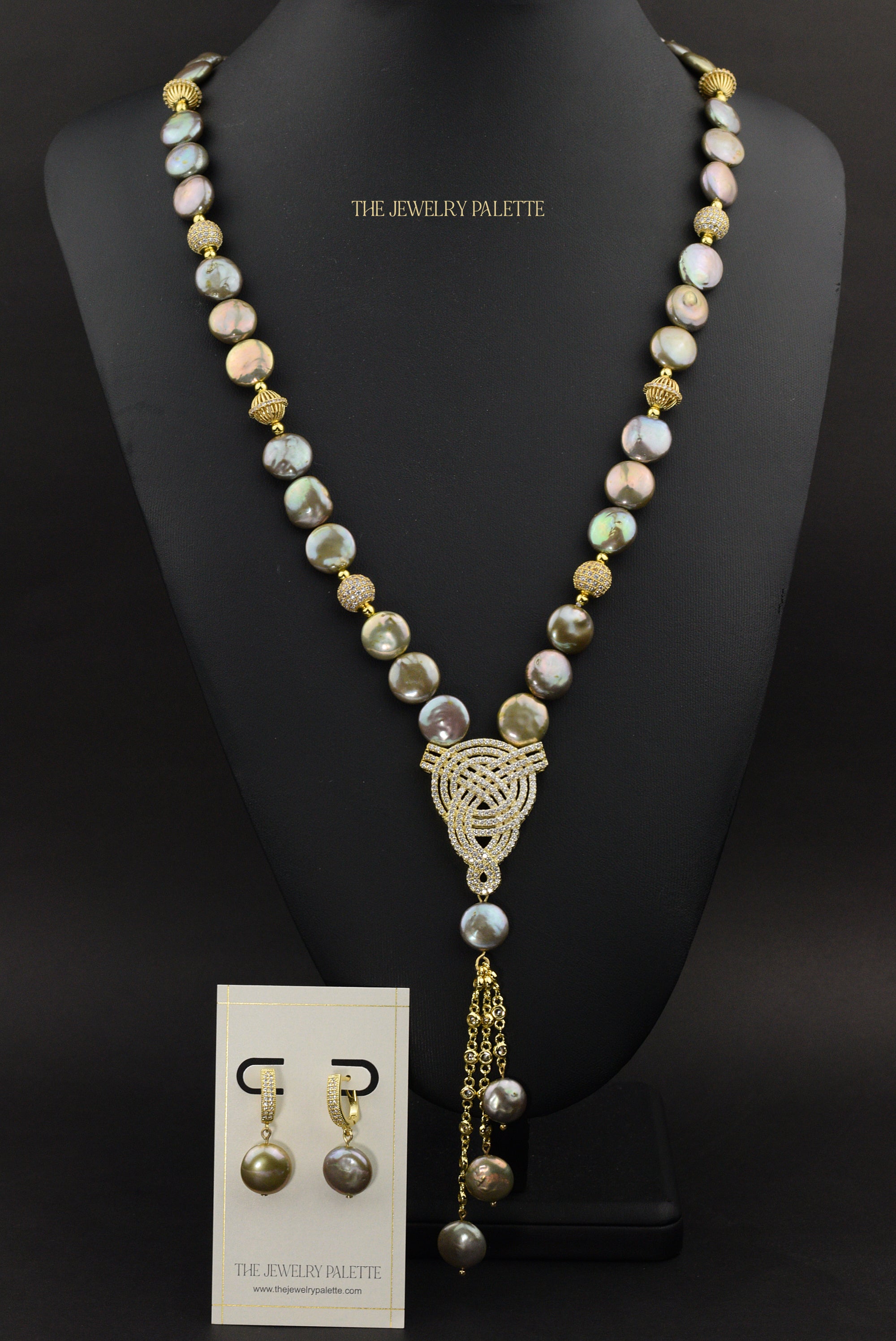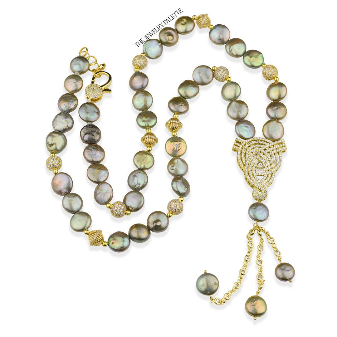 • Look sleek and sophisticated in the intricately designed Veronica necklace. It features lustrous coin pearls with iridescent hues of green, gold and grey and high quality zircon studded gold accents. A finely detailed zircon studded gold pendant and chain tassel add exceptional allure to this expensive-looking piece.