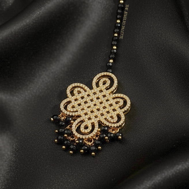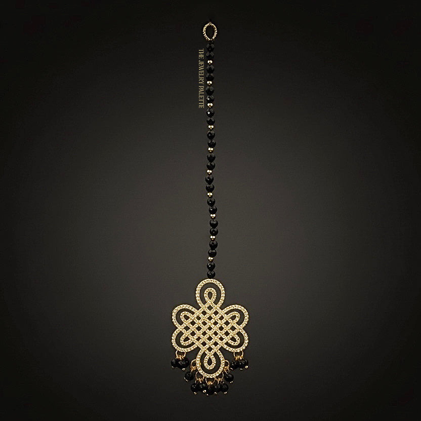 • Composed of a string of tiny faceted black onyx stones with gold accents and an exquisite zircon studded gold centerpiece hanging from it. Small black onyx stone clusters at the bottom add the perfect finishing touch.