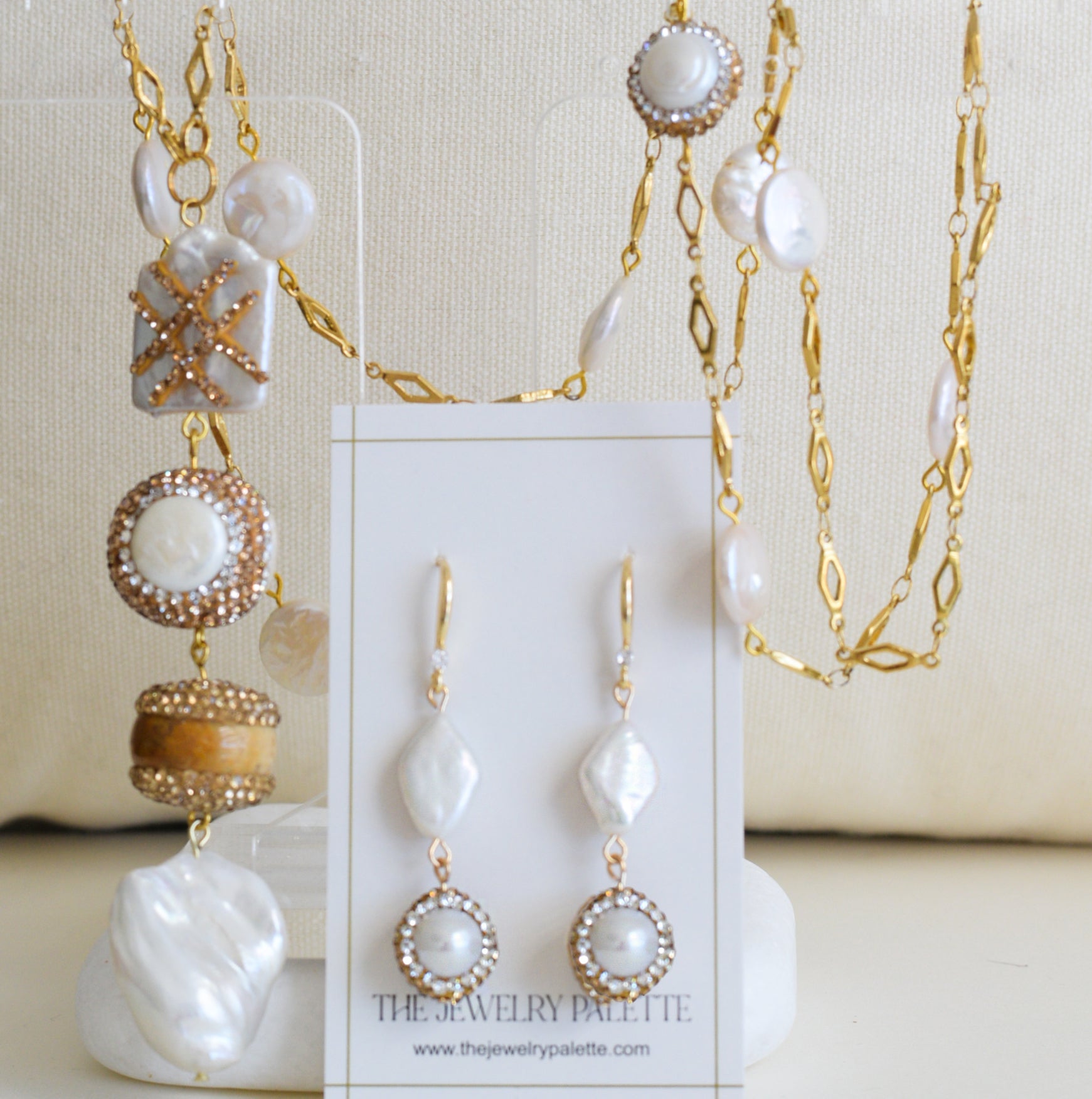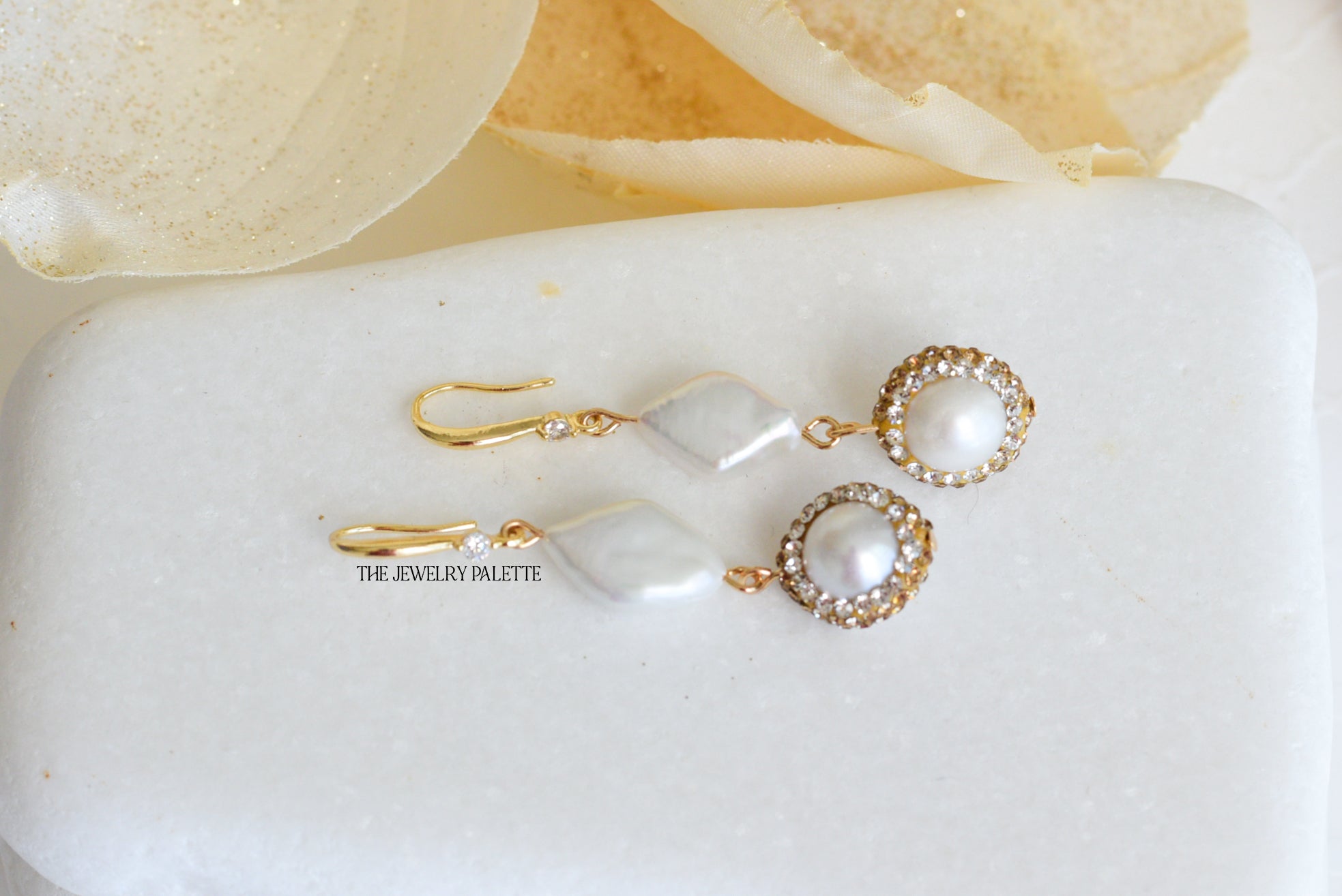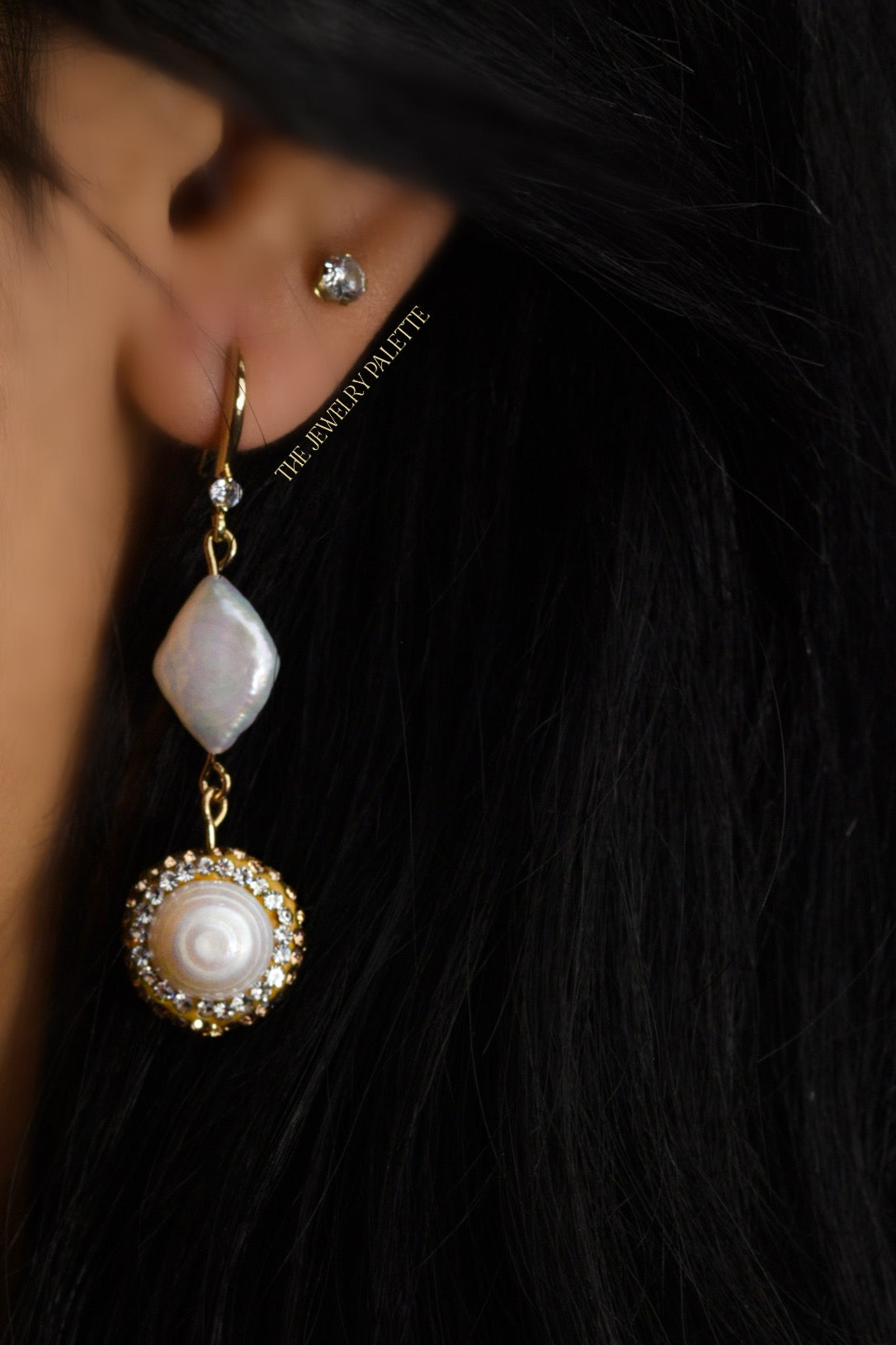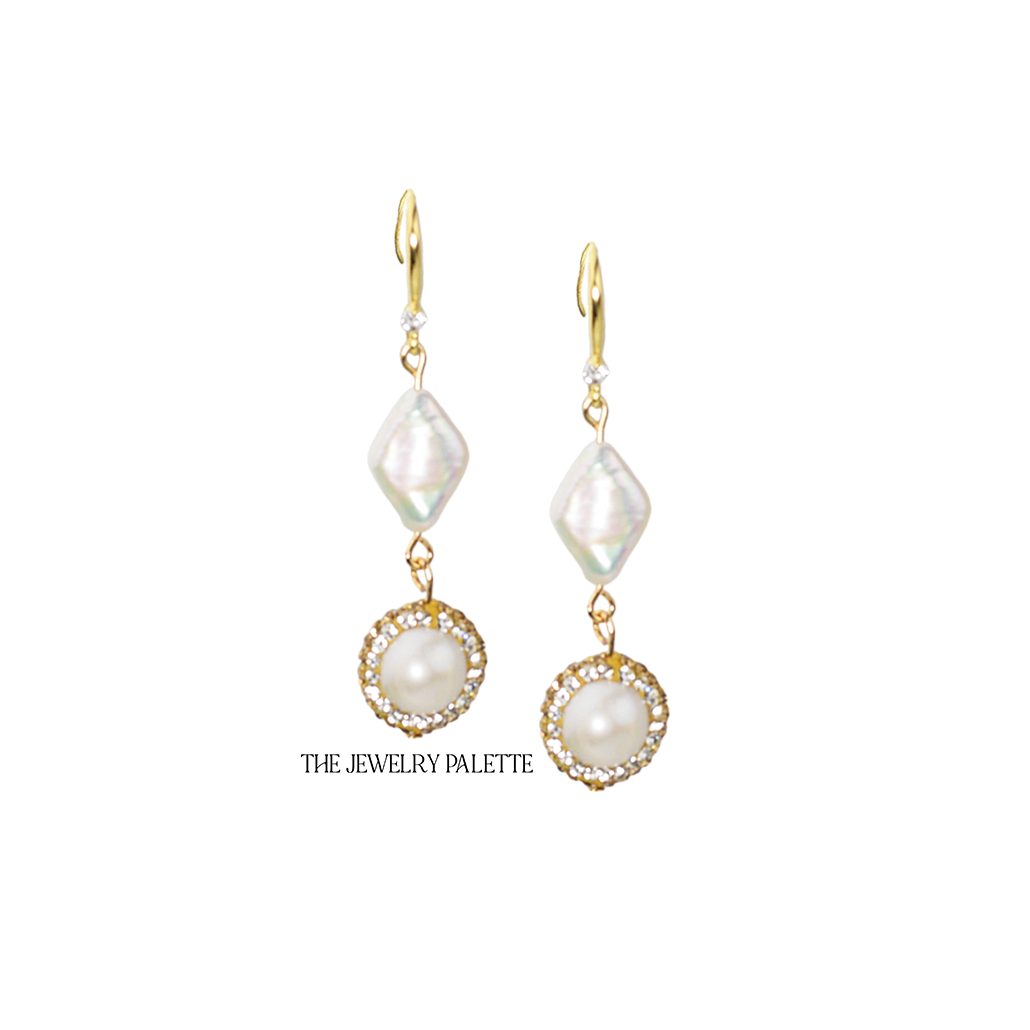 • Composed of 14 K gold-plated earring hooks, unique diamond shaped white pearls and mother of pearl beads surrounded by a halo of zircons.