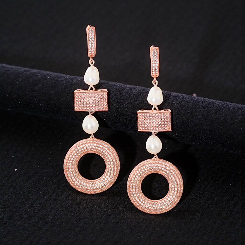 • Composed of 24 K rose gold-plated zircon-studded earring hooks, shimmering zircon-encrusted rose gold accents and white freshwater pearl drops.