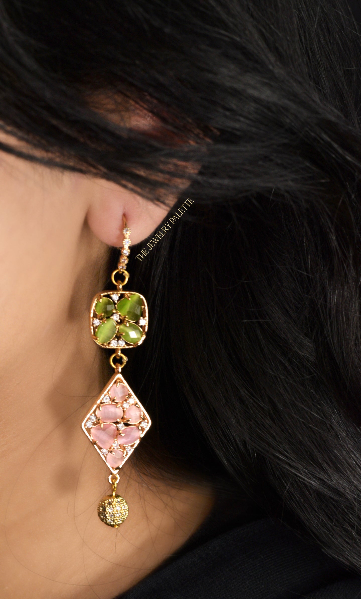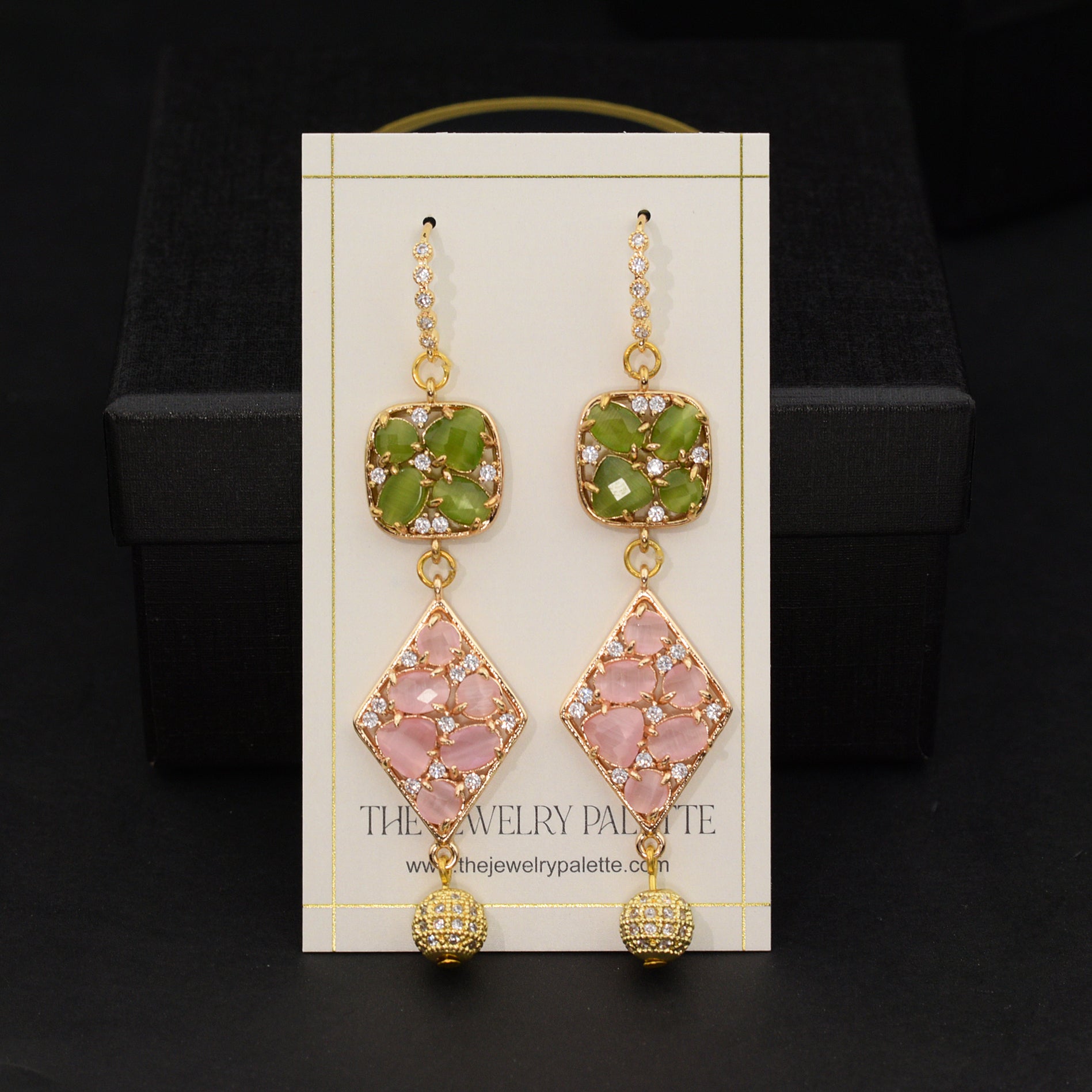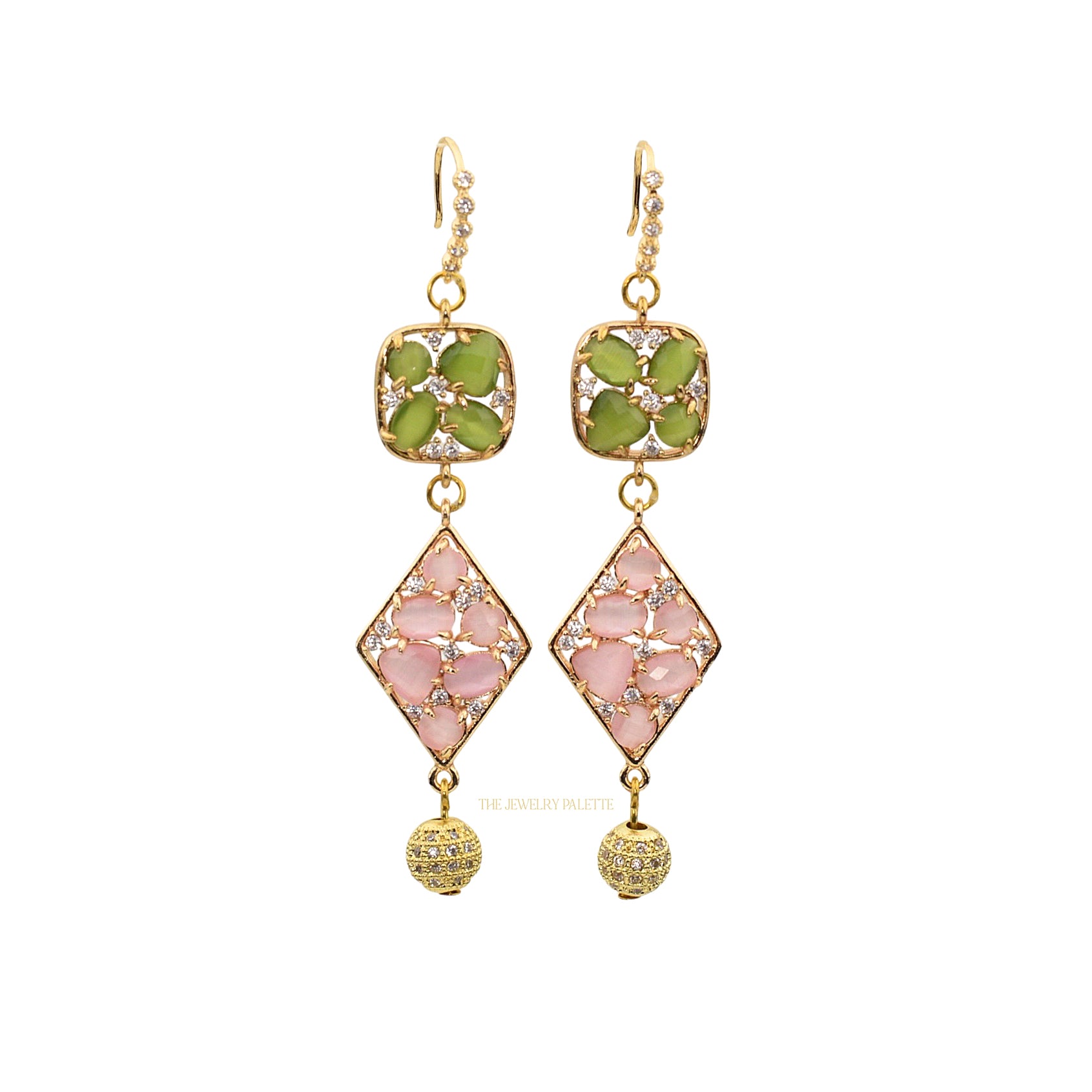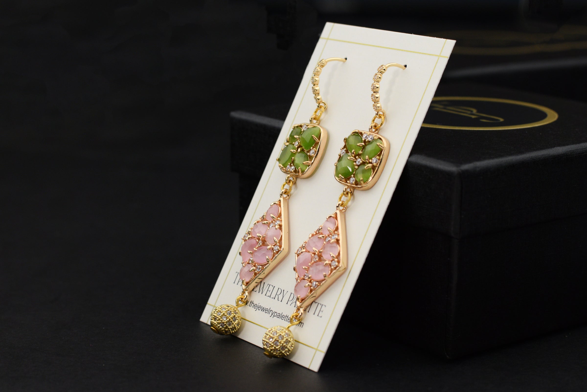 Cynthia long earrings in green and pink stones